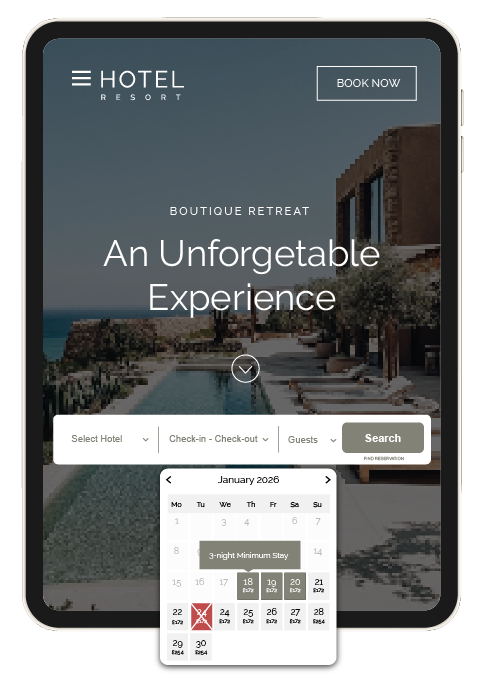 Calendar display expands showing live rates and availability. The calendar displays minimum length of stays, sold out rooms, no departure and no arrivals. The widget also responds to user inputs on the widget and externally on website, ultimately directing through to the booking engine.